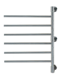 The unique style of this towel warmer is perfect where space is limited. This plug-in model has bars that rotate 180 degrees, independently from one another. They can be pulled out from the wall when in use and pushed back when done. With a total of 6 horizontal bars, in a polished finish, this model is suitable for 2 or 3 towels. Unit dimensions are 22"W x 29"H. Programmable timers can be added for additional control.