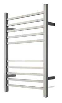 The modern style of this towel warmer in a brushed finish with 10 square bars, in a 5-5 configuration, enhances any bathroom. Perfectly sized to accommodate 2 towels, it warms them up and dries them out while helping to reduce humidity in the bathroom. This plug-in model requires no electrical work. Plug it in, turn it on using the integrated switch, and you are ready to go! Unit dimensions are 24"W x 32"H. An optional programmable timer can be added for additional functionality.