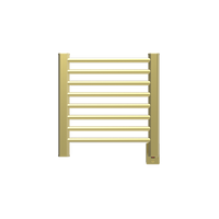The dual-purpose Towel Warmer and Radiator in a Satin Brass finish features 8 polished horizontal bars features a stylish, contemporary design. It is perfect to warm and dry 1 towel, while keeping the bathroom dry, warm and mildew free. Included is a cover plate kit with an on/off switch. This unit can be installed vertically, horizontally or upside down depending on the application. The distance from the wall can be adjusted between 4" and 4 3/4". Unit dimensions are 21"W x 21"H. Accessories such as Bathrobe Hangers, Towel Bars, Digital Heat Controllers and Programmable Timers can be added to the unit for extra functionality. Wiring is also available on the left side, by special order.